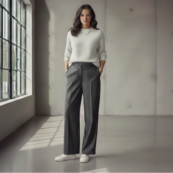 When comfort starts to matter but your shape hasn’t changed much yet. Soft waistbands, slightly oversized silhouettes, and breathable fabrics that move with subtle transitions: smart, not stretchy.